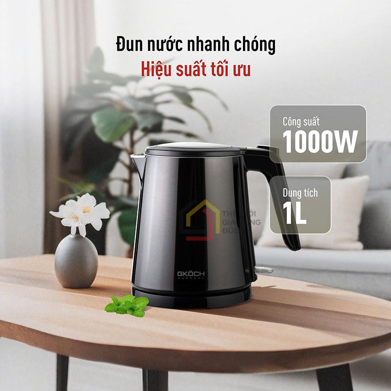 Với công suất 1000W, ấm siêu tốc GKÖCH giúp đun sôi nước nhanh chóng trong thời gian ngắn, đáp ứng tốt nhu cầu pha trà, cà phê, sữa hay nấu mì, đồng thời vẫn đảm bảo hiệu quả tiết kiệm điện năng khi sử dụng hàng ngày.