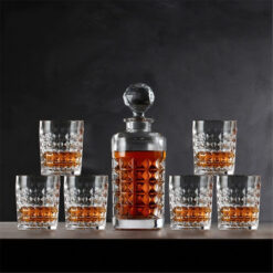 Bộ bình rượu kim cương Bohemia Diamond gây ấn tượng mạnh mẽ với thiết kế sang trọng, tinh xảo trên nền chất liệu pha lê trong suốt và bền màu. Các đường cắt sắc sảo cùng họa tiết kim cương lấp lánh tạo hiệu ứng phản quang tuyệt đẹp, mang đến vẻ rực rỡ và nổi bật. Bộ sản phẩm không chỉ là vật dụng thưởng thức rượu mà còn là điểm nhấn quý giá cho không gian sống, khẳng định gu thẩm mỹ tinh tế của gia chủ.