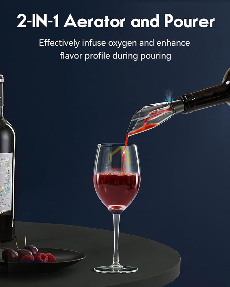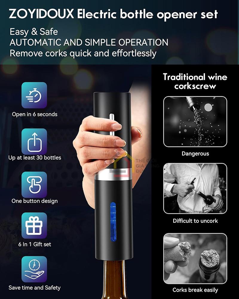 - Đa năng 6 trong 1: Gồm khui điện, dao cắt niêm phong, nắp hút chân không, dụng cụ rót rượu, cáp sạc USB và phụ kiện đi kèm.