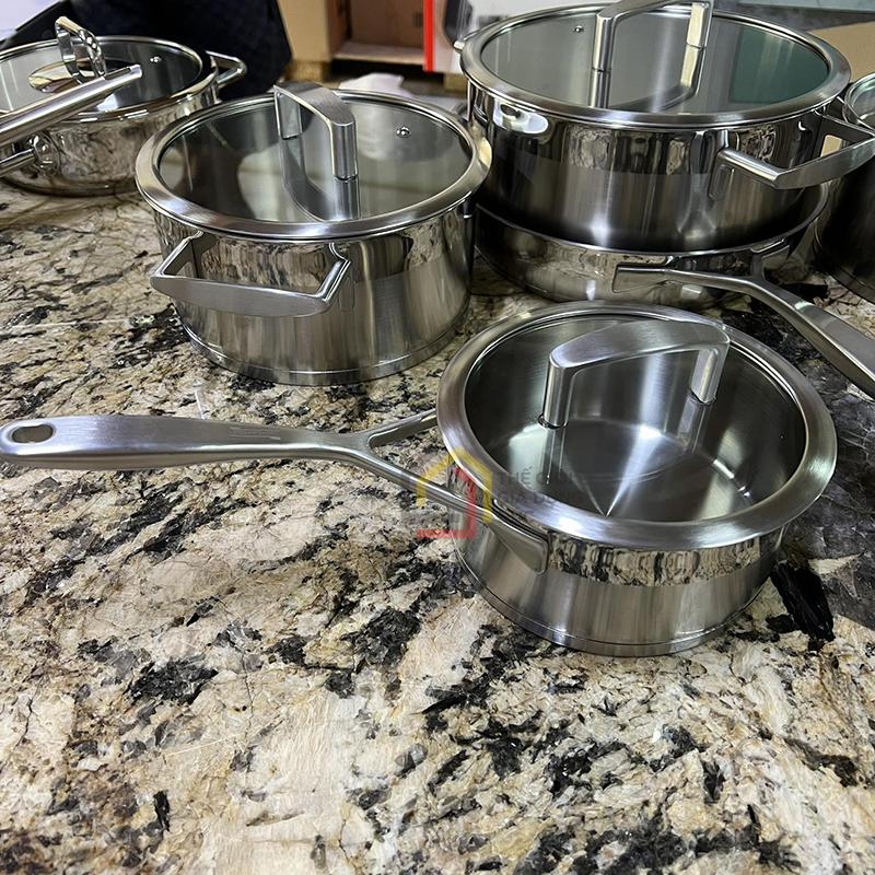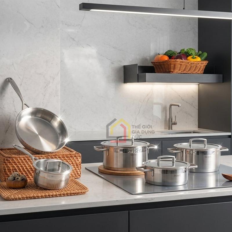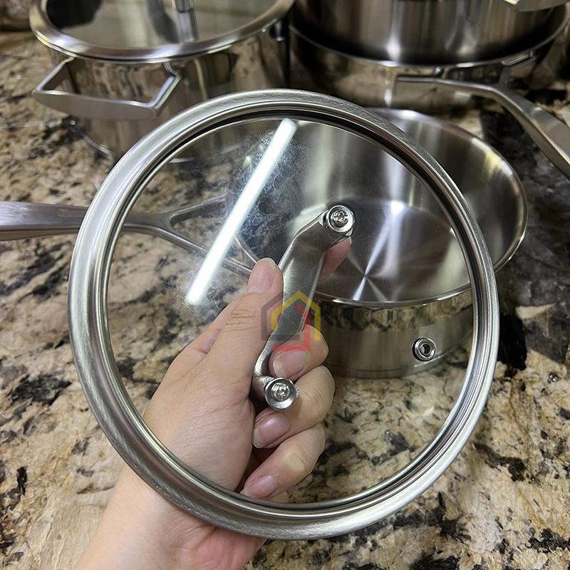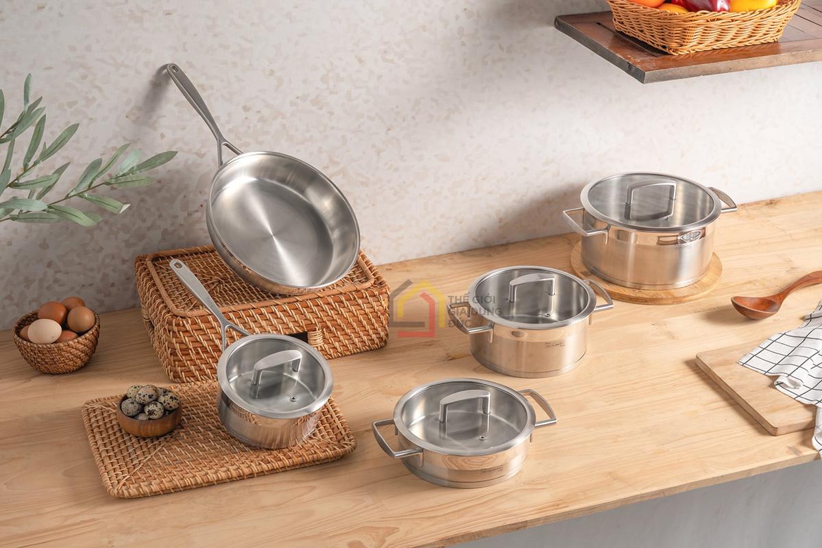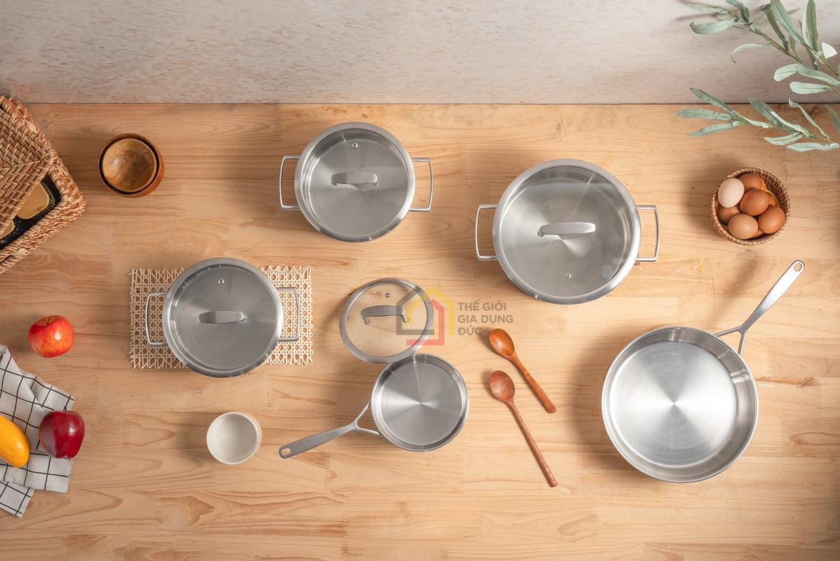 Từng chi tiết của bộ nồi đều được gia công tỉ mỉ, bề mặt sáng bóng hiện đại, góp phần nâng tầm không gian bếp và tạo cảm hứng nấu nướng mỗi ngày.