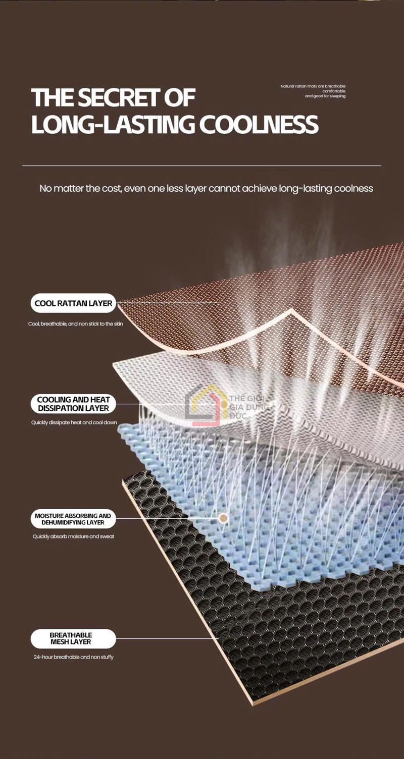 Cấu trúc dệt thông minh giúp chiếu luôn thông thoáng, hạn chế tích nhiệt và hút ẩm hiệu quả, giữ cho bề mặt luôn khô ráo, dễ chịu.