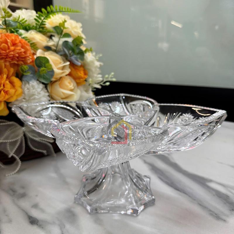 Khay mứt 4 cánh hoa pha lê mài chân cao Bohemia là điểm nhấn tinh tế cho bàn tiệc và không gian phòng khách, đặc biệt phù hợp trong những dịp lễ tết và tiếp khách trang trọng. Sản phẩm mang đậm phong cách hoàng gia châu Âu với thiết kế chân cao thanh thoát, vừa tôn lên vẻ đẹp của pha lê vừa tạo cảm giác sang trọng và đẳng cấp.