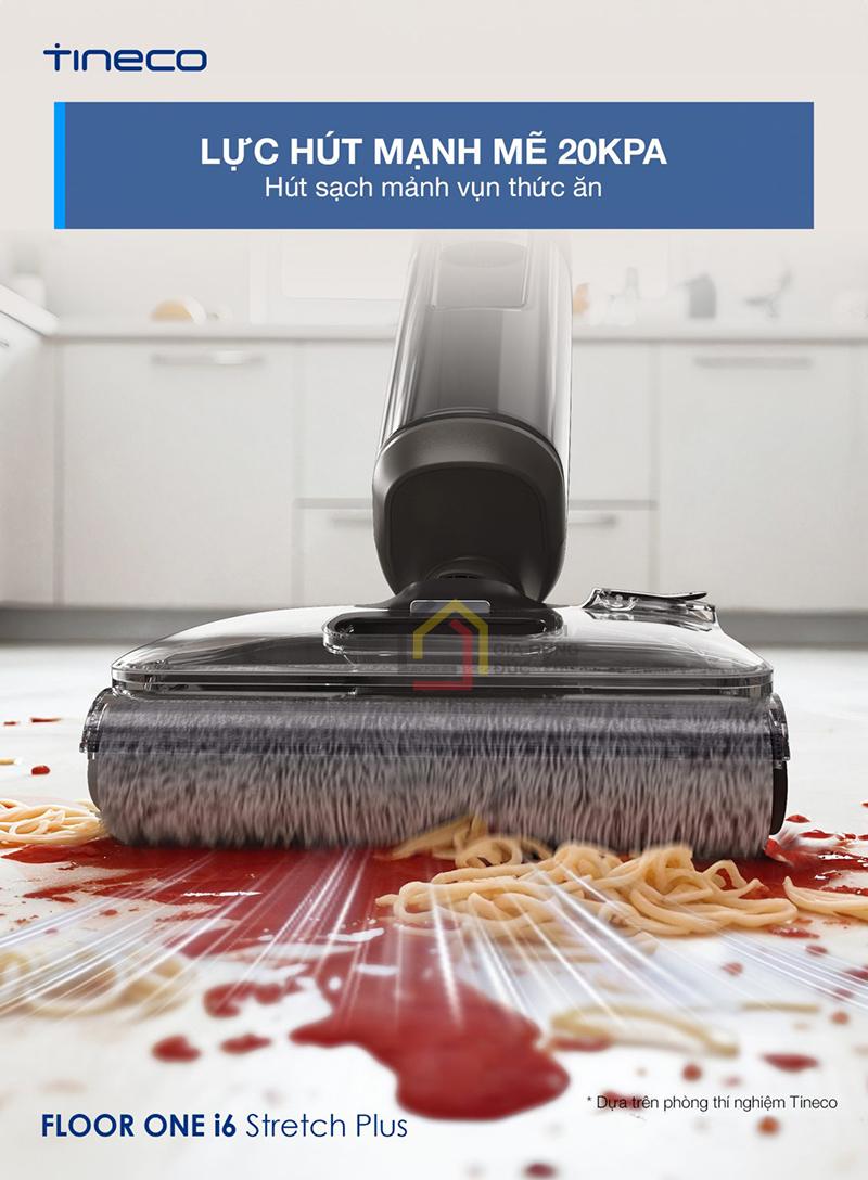 Tineco Floor One i6 Stretch Plus được trang bị lực hút cực mạnh lên đến 20.000Pa, giúp xử lý hiệu quả cả bụi mịn, mảnh vụn nhỏ và vết bẩn cứng đầu trên mọi loại bề mặt. Nhờ công suất động cơ lên đến 220W, thiết bị có khả năng làm sạch sâu cả vết bẩn khô lẫn ướt, giữ cho sàn nhà luôn sáng bóng và sạch khuẩn.