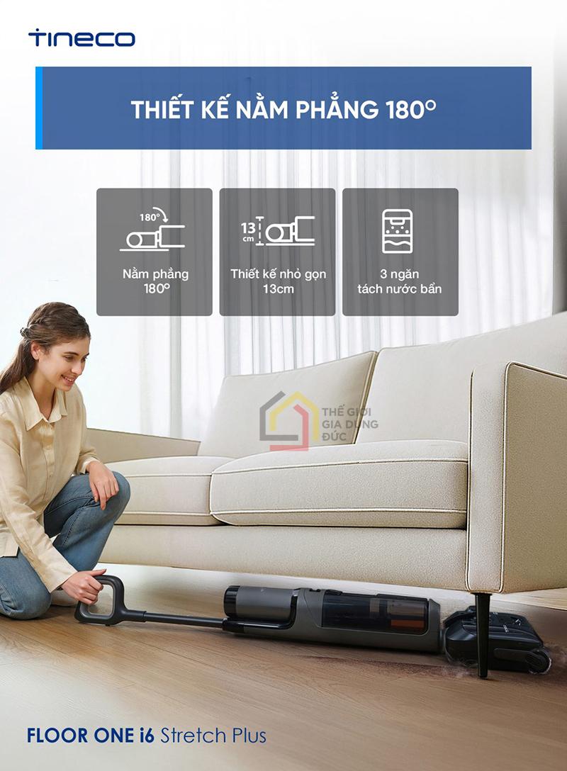 Với thiết kế ngả phẳng linh hoạt đến 180 độ và chiều cao chỉ 13cm khi nằm ngang, máy hút bụi Tineco Floor One i6 Stretch Plus dễ dàng len lỏi dưới gầm giường, ghế, tủ và các khu vực khó tiếp cận. Điều này giúp người dùng không bỏ sót bất kỳ vị trí nào trong quá trình làm sạch.