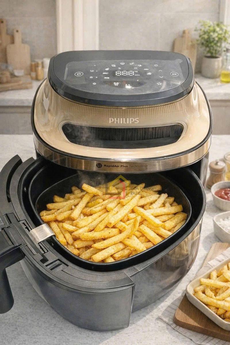 Ứng dụng công nghệ AirFry giúp thực phẩm chín đều, giòn bên ngoài mà không cần lật nhiều lần. Hạn chế dầu mỡ, tốt cho sức khỏe nhưng vẫn giữ được hương vị hấp dẫn.
