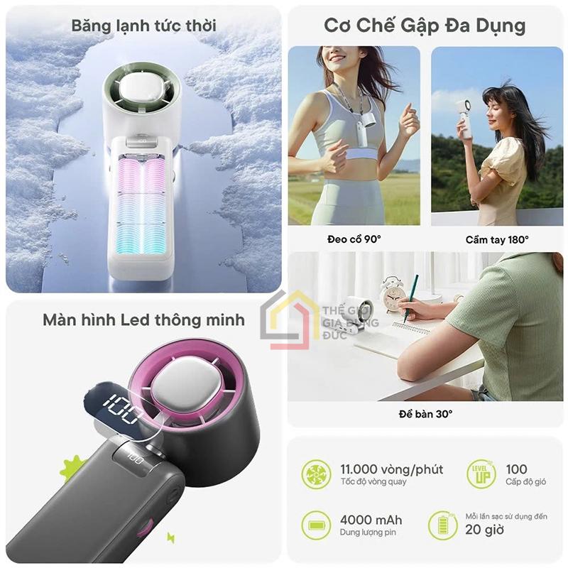 Sản phẩm tích hợp 10 cấp độ gió linh hoạt, hỗ trợ sạc USB Type-C nhanh, và khả năng xoay – gập đa góc cho nhiều cách sử dụng, đáp ứng mọi nhu cầu làm mát cá nhân một cách tinh tế và hiệu quả.