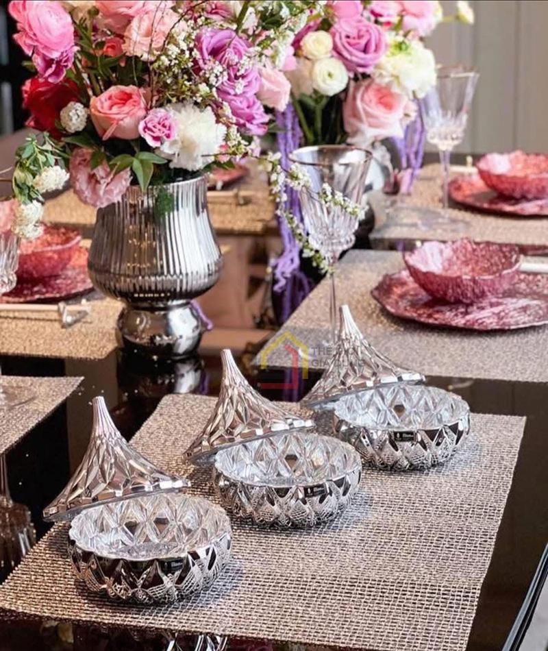 Set thố mứt được lấy cảm hứng từ viên socola Hershey Kiss nổi tiếng, mang vẻ đẹp ngọt ngào, mới lạ và đầy tinh tế. Lớp phủ bạc kết hợp cùng form dáng tròn mềm mại giúp sản phẩm bắt sáng ấn tượng. Dù đặt ở bàn trà hay kệ trưng bày, bộ thố vẫn luôn nổi bật và thu hút ánh nhìn.
